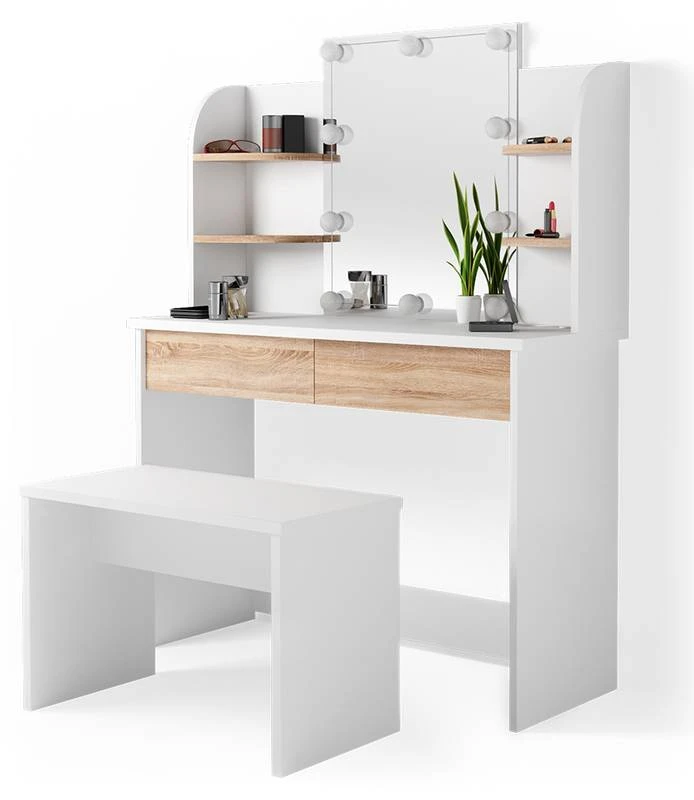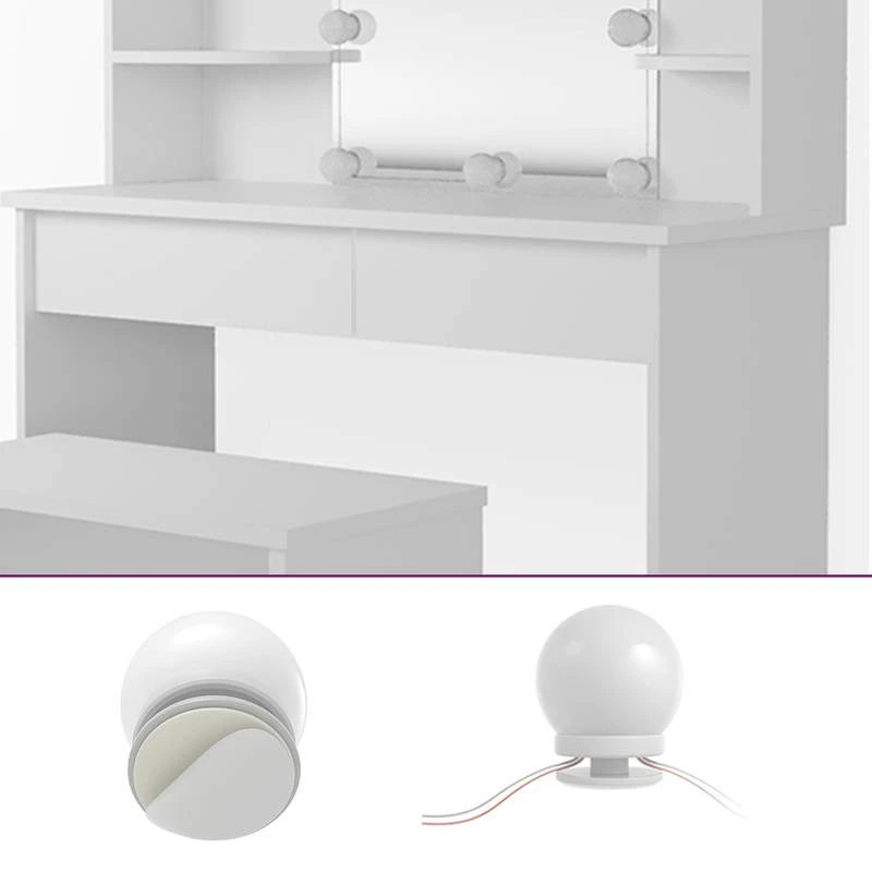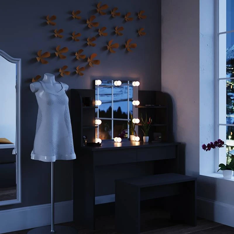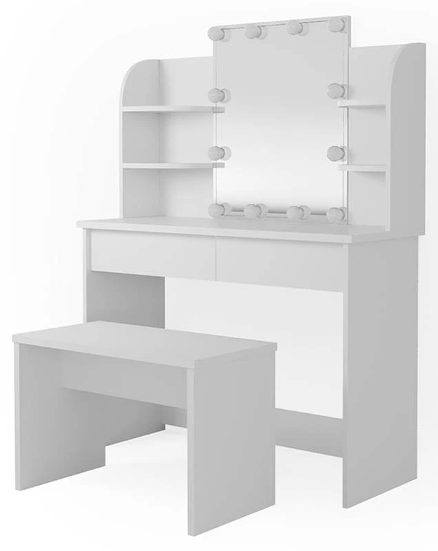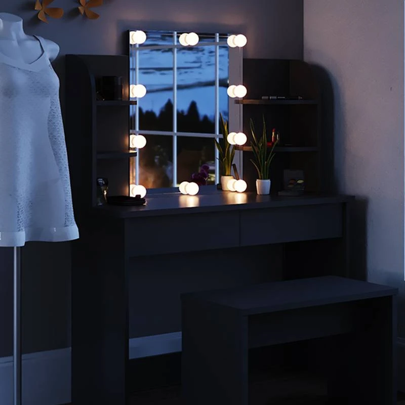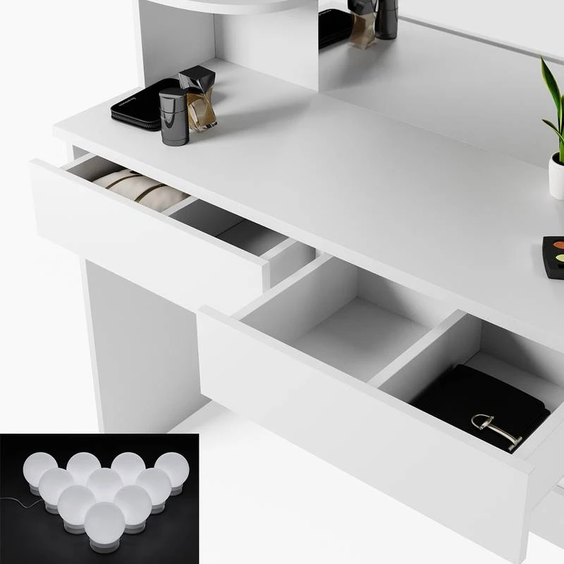 - Contenu de la livraison : • 1x table de maquillage Charlotte + 1x banc d’assise + 10 boules lumineuses à LED Remarque : La décoration n’est pas comprise dans la livraison.