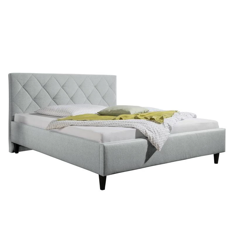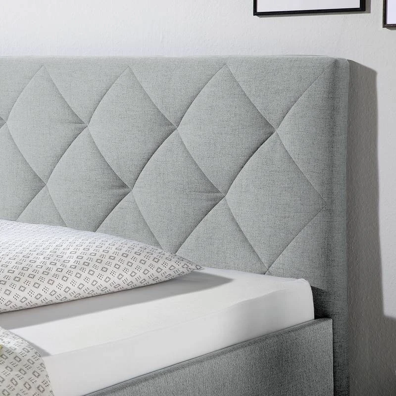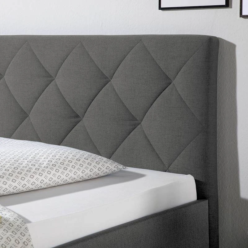 - Autres caractéristiques : Cadre de lit avec tête de lit (environ 9 cm d’épaisseur, rembourré avec piquage en losanges). Hauteur de couchage réglable grâce à 4 équerres en métal