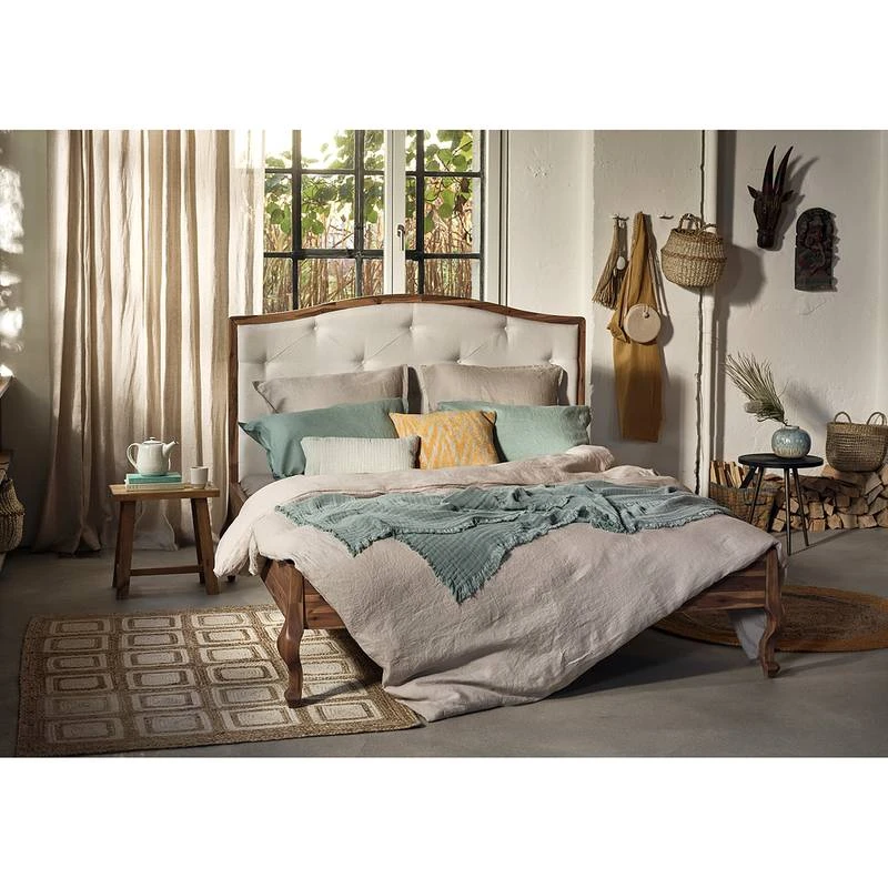 - Tête de lit : partiellement en acacia massif teinté caramel, capitonnage crème 100 % tissage de polyester