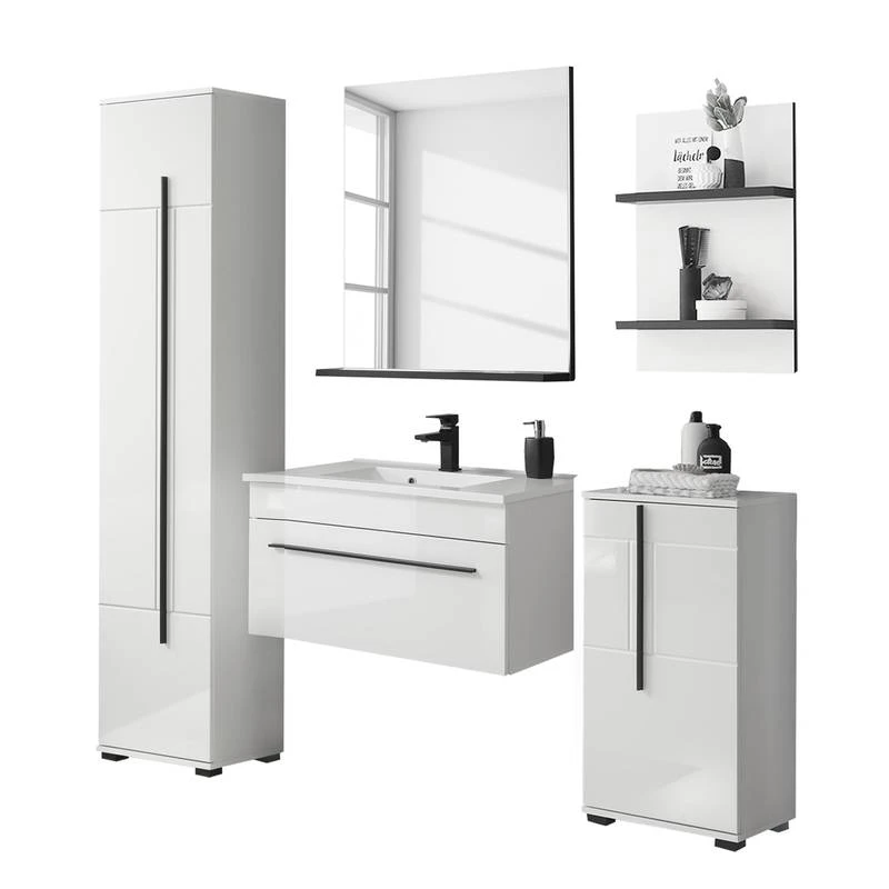 - Contenu de la livraison : Salle de bain comprenant 1 meuble avec vasque en fonte minérale, 1 colonne de salle de bain (charnières à gauche), 1 meuble bas (charnières à droite), 1 étagère murale et 1 miroir