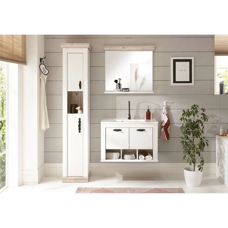 - Contenu de la livraison : Ensemble de salle de bain comprenant 1 meuble avec vasque en fonte minérale, 1 armoire colonne et 1 miroir