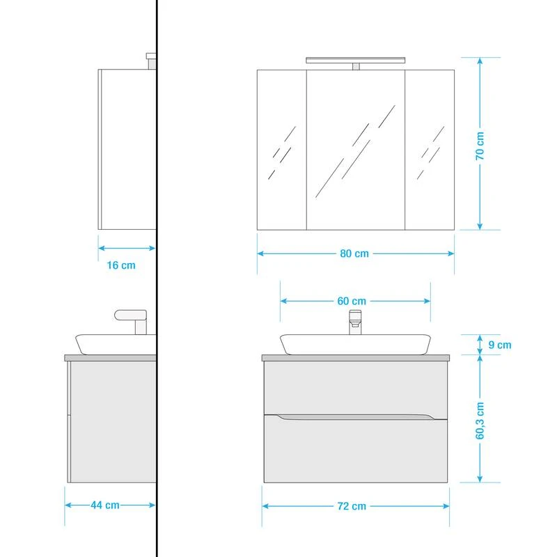 - Armoire de toilette (LxHxP) : 80 x 70 x 16 cm